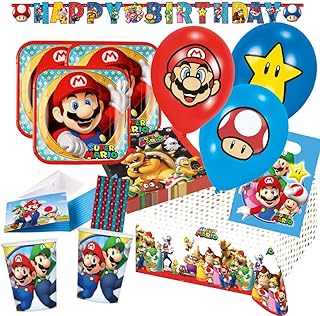 amscan/spielum 68-teiliges Party-Set Super Mario - Teller Becher Servietten Tischdecke Girlande, Partytüten, Einladungen, Trinkhalme, Luftballons für 8 Kinder