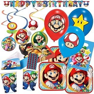 amscan/spielum 87-teiliges Party-Set Super Mario - Teller Becher Servietten Dekospiralen Girlande, Partytüten, Einladungen, Partyhütchen, Trinkhalme, Luftballons für 8 Kinder