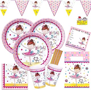 Rachel Ellen/Hobbyfun 61-teiliges Party-Set Kleine Ballerina - Teller Becher Servietten Einladungen Partytüten Wimpelkette Trinkhalme für 8 Kinder
