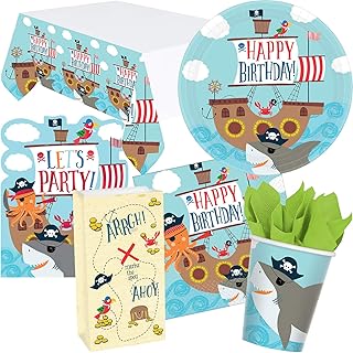 101-tlg. PARTY SET * AHOY * für Kindergeburtstag mit 8 Kinder: Teller + Becher + Servietten + Einladungen + Tischdecke + Partytüten + Luftschlangen + Luftballons | Ahoi Pirat Kinderpiraten Seeräuber