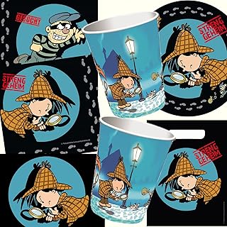 104-teiliges Party-Set * DETEKTIV FLO * für Kindergeburtstag mit 8 Kinder: Teller, Becher, Servietten, Einladungen, Partytüten, Luftballons u.v.m. // Kinder Geburtstag Partyset Kinderparty Kinderfest Fete Ball Party Deko Mottoparty Motto Set Flo Sherlock Holmes