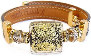 Damen Armband mit quadratischer Perle aus original Muranoglas und echtem Toskana Leder, Kollektion Kate