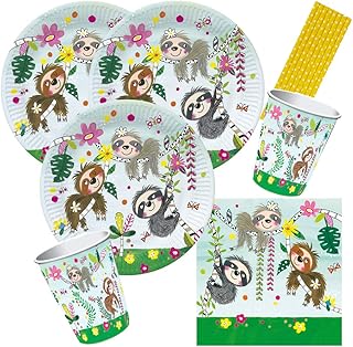 Rachel Ellen/Hobbyfun 44-teiliges Party-Set Faultier - Teller Becher Servietten Trinkhalme für 8 Kinder