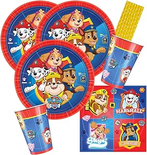 Amscan/Hobbyfun 64-teiliges Party-Set Paw Patrol - Teller Becher Servietten Trinkhalme für 16 Kinder